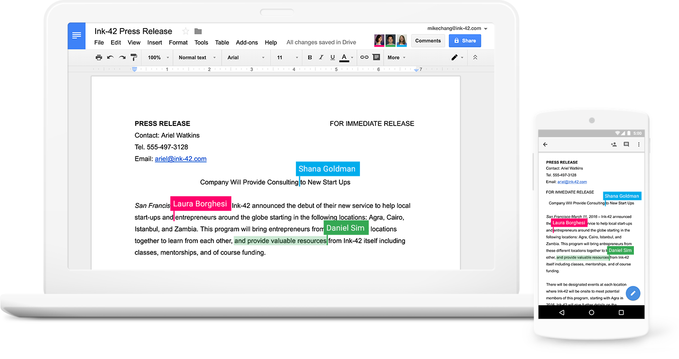 Varias personas pueden trabajar en un mismo archivo de forma simultánea y todos los cambios se guardan automáticamente.